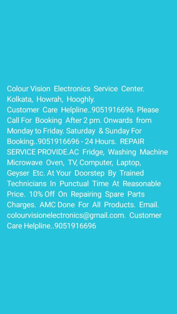Colour Vision Electronics Service Center. Customer Care Helpline..9051916696 Posted byColour Vision Electronics Service Center15th Jul 2023Posted inUncategorized Share this: Click to share on X (Opens in new window) X Click to share on Facebook (Opens in new window) Facebook Like Loading... Related Published by Colour Vision Electronics Service Center I am working in this company View more posts